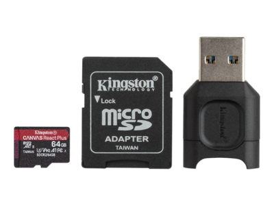 Kingston Canvas React Plus - Flash-minneskort (microSDXC till SD-adapter inkluderad) - 64 GB - A1 / Video Class V90 / UHS-II U3 / Class10 - mikroSDXC UHS-II MLPMR2/64GB