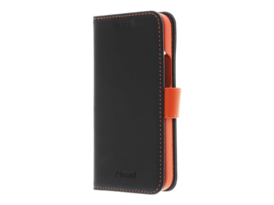 Insmat Exclusive Flip Case - Vikbart fodral för mobiltelefon - genuint läder, polykarbonat, bomullssömmar, kartong+papper - svart och orange - för Apple iPhone 14