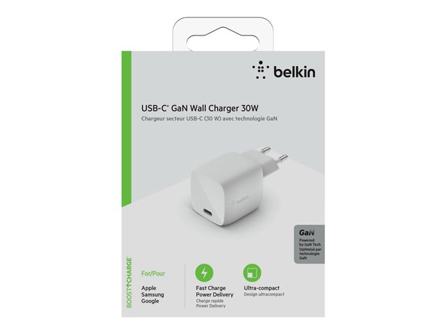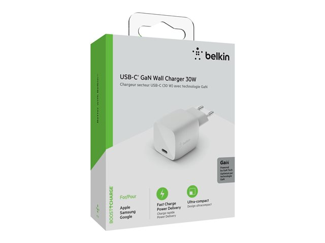Belkin BOOST CHARGE - Strömadapter - 30 Watt - snabbladdning/kraftleverans (USB-C) - vit WCH001VFWH