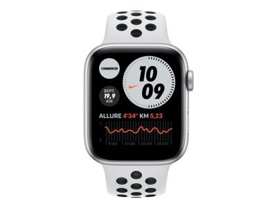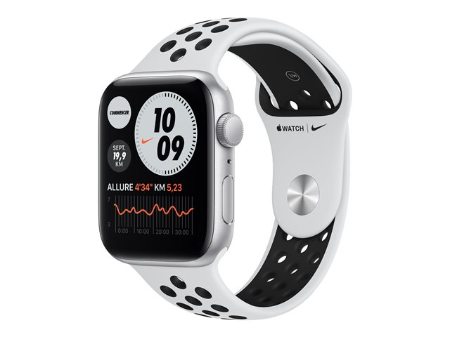 Apple Watch Nike SE (GPS) - 44 mm - silveraluminium - smart klocka med Nike sportband - fluoroelastomer - ren platina/svart - bandstorlek 140-210 mm - S/M/L - 32 GB - Wi-Fi, Bluetooth - 36.2 g