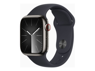 Apple Watch Series 9 (GPS + Cellular) - 41 mm - grafit rostfritt stål - smart klocka med sportband - fluoroelastomer - midnatt - bandstorlek: M/L - 64 GB - Wi-Fi, Bluetooth, UWB, LTE - 4G - 42.3 g MRJ93KS/A