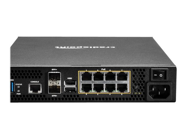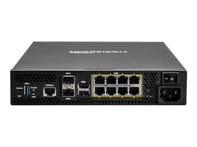 | Gränssnitt | WAN / LAN: 8 x 10Base-T/100Base-TX/1000Base-T (PoE) - RJ-45 WAN / LAN: 2 x 10Gb Ethernet / 1Gb Ethernet - SFP/SFP+ Konsol: 1 x RJ-45 USB 2.0: 2 x 4-stifts USB typ A USB 3.0: 1 x 9-stifts USB typ A |