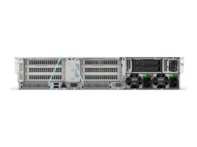 | Gränssnitt | 1 x HPE iLO (1 på framsidan) (service port) 5 x USB 3.2 Gen 1 (1 fram, 2 bak, 2 interna) 1 x VGA 2 x LAN (Gigabit Ethernet) |