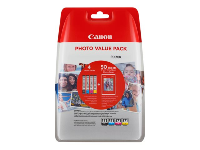 Canon CLI-571 C/M/Y/BK Photo Value Pack - 4-pack - 7 ml - svart, gul, cyan, magenta - original - 100 x 150 mm 50 ark bläckbehållare / papperspaket - för PIXMA TS5051, TS5053, TS5055, TS6050, TS6051, TS6052, TS8051, TS8052, TS9050, TS9055