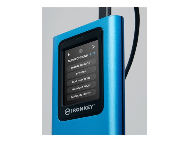 | Egenskaper | Säker raderingsfunktion, Master and User Dual Passwords, färgpekskärm, Endast läsning (skrivskyddat) - dubbelt läge, skydd mot BadUSB-attack, konfigurerbara lösenordsregler, PIN-/lösenordslägen, Brute-Force Password Attack Protection, automatisk låsning |