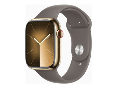 Apple Watch Series 9 (GPS + Cellular) - 45 mm - guld, rostfritt stål - smart klocka med sportband - fluoroelastomer - clay - bandstorlek: M/L - 64 GB - Wi-Fi, Bluetooth, UWB, LTE - 4G - 51.5 g