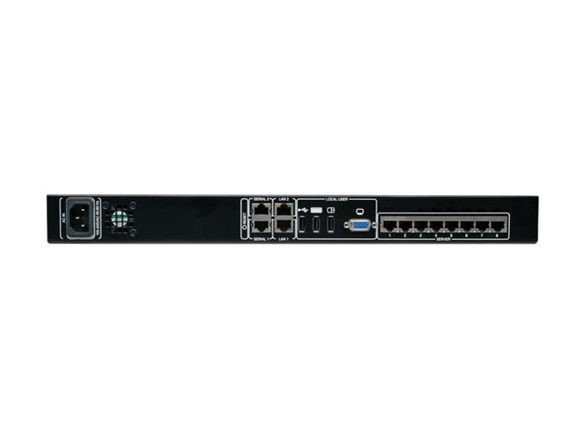 | Gränssnitt | 8 x KVM RJ-45 1 x VGA HD-15 3 x USB Type A 2 x seriell RJ-45 hantering 2 x LAN RJ-45 |