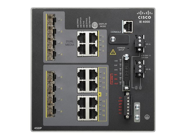 | Gränssnitt | 4 x 100Base-TX RJ-45 PoE+ 4 x 1000Base-T RJ-45 upplänk 4 x SFP upplänk 1 x mini-USB Type B 1 x konsol RJ-45 4 x 100Base-TX RJ-45 |